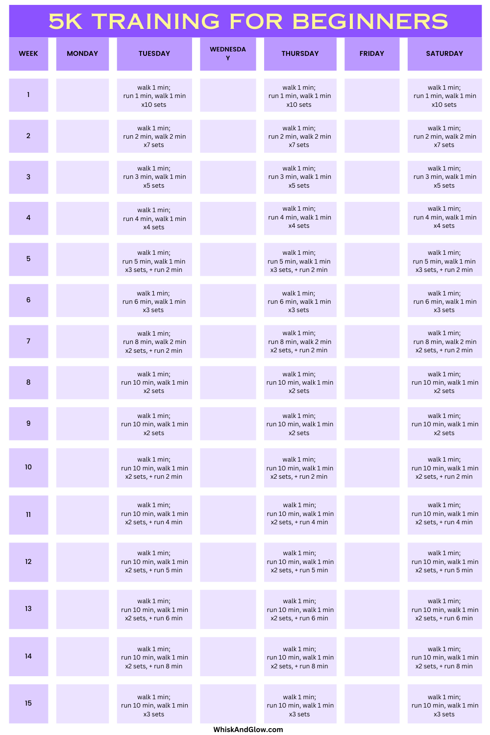 This beginner-friendly plan is intentionally stretched over 15 weeks, allowing for easy adjustments to match your fitness level. If it feels too easy or challenging, modify by repeating weeks or skipping ahead. Sickness or unforeseen setbacks? No worries! Just tweak the plan to keep your running plan on track.