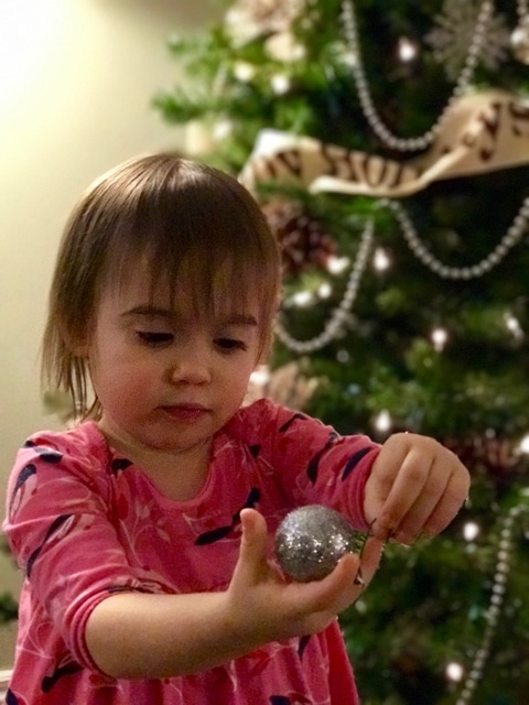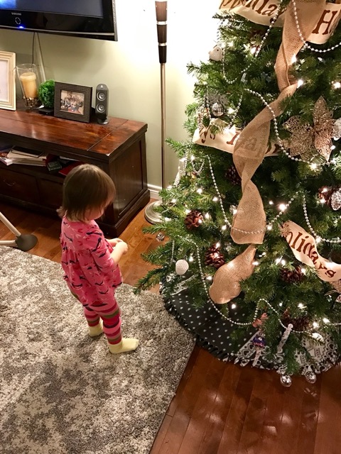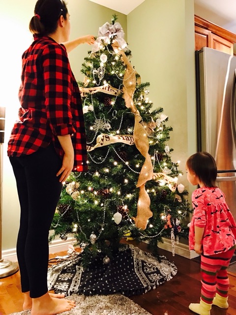To top it all off, I added silver-toned ribbon bow instead of a star. This brought my brown and grey theme together nicely, to set off the silver hanging ornaments, beads, and sparkly lights.