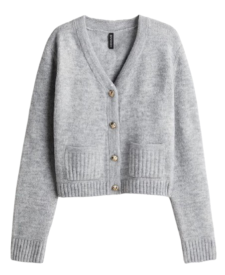 This cropped knit cardigan provides a lightweight option for those slightly cooler days and adds a touch of elegance with its beautiful gold-toned buttons. It's perfect for layering over a simple white top.