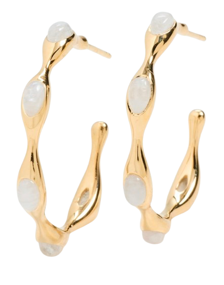 These hoops feature gemstones that add a pop of color and elegance. They are large enough to make a statement but still maintain a classic feel. I love the white-toned gemstone accent, which ties in the white accents in the outfit.