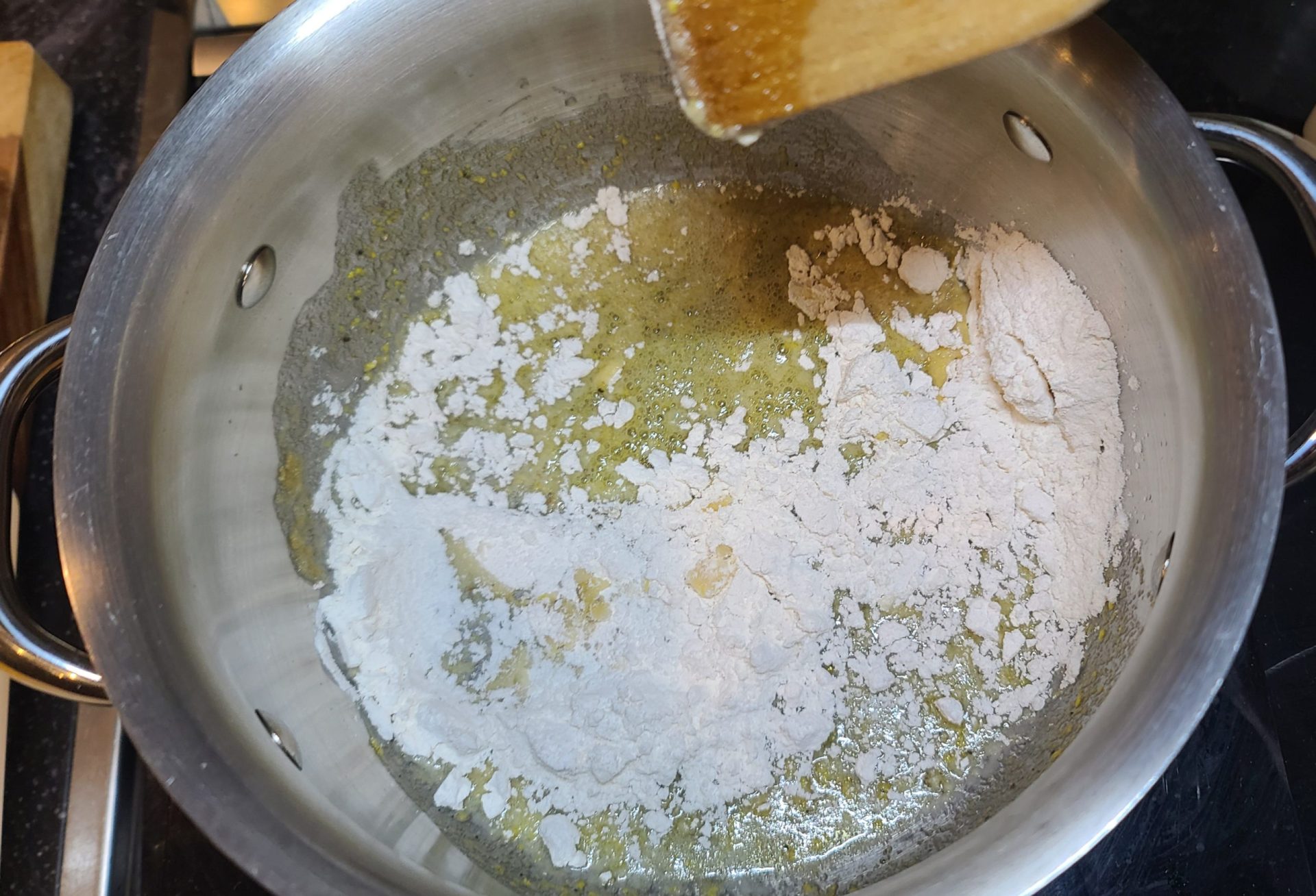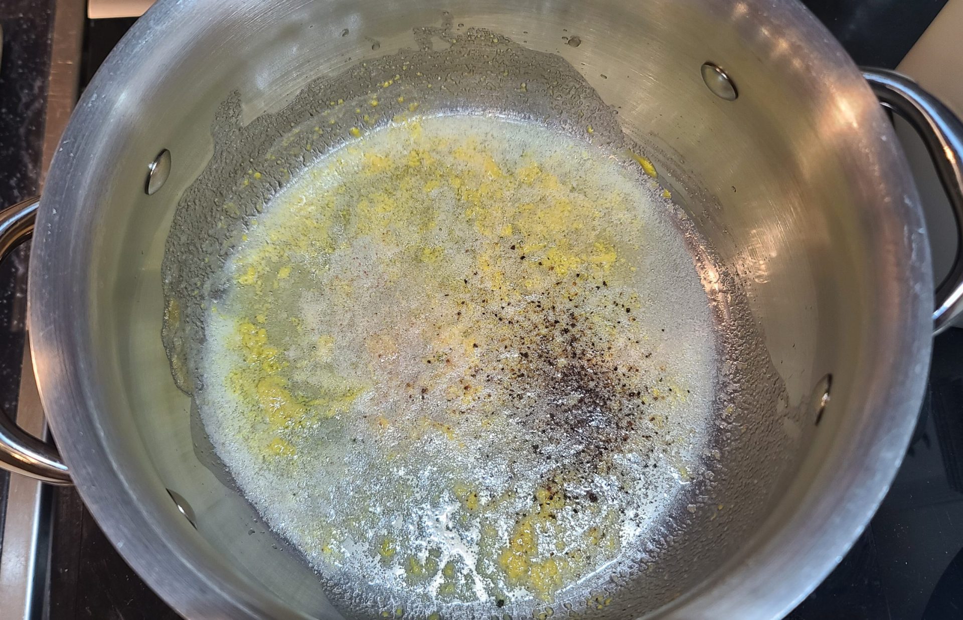 - Add minced garlic, salt, and pepper to the melted fats.