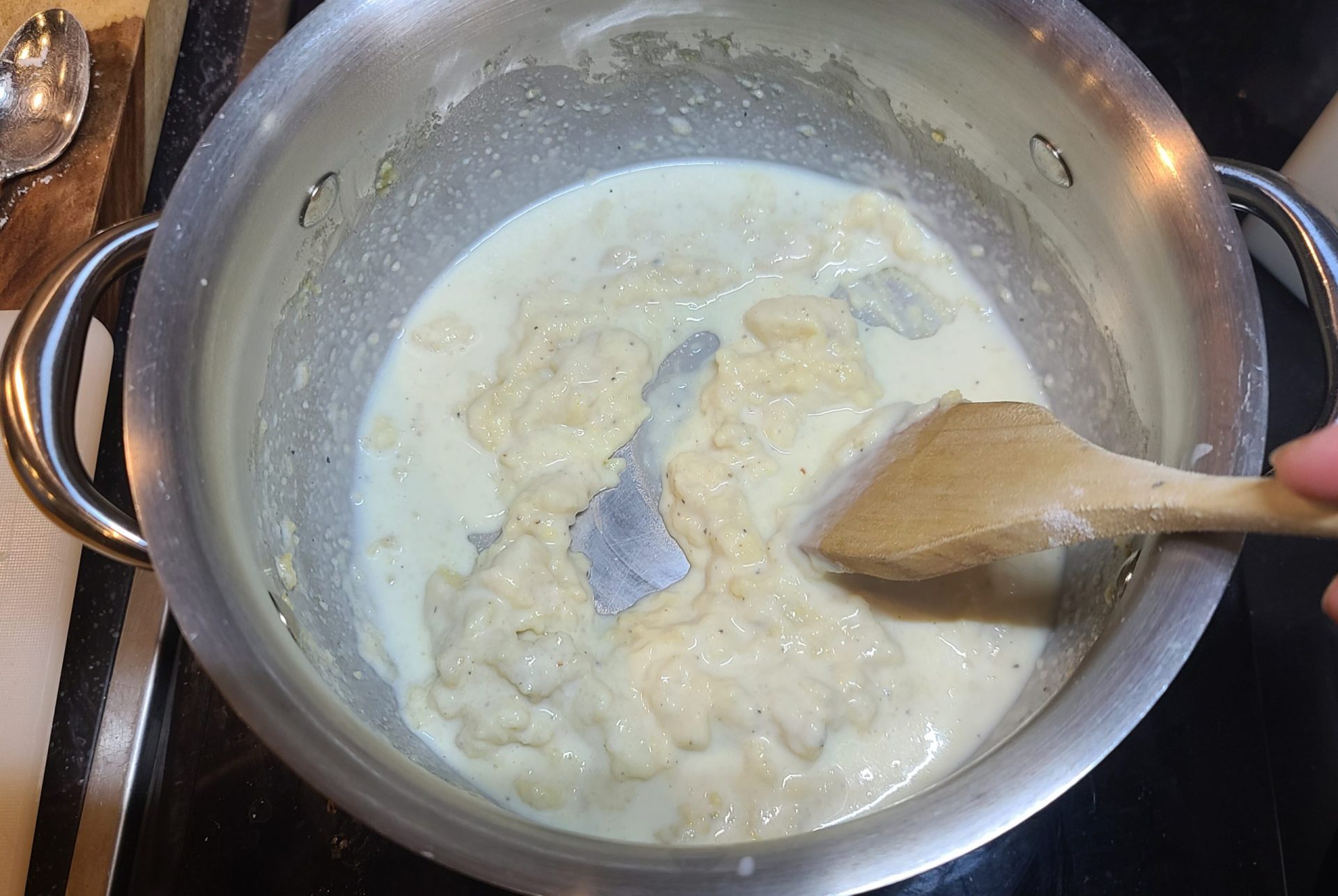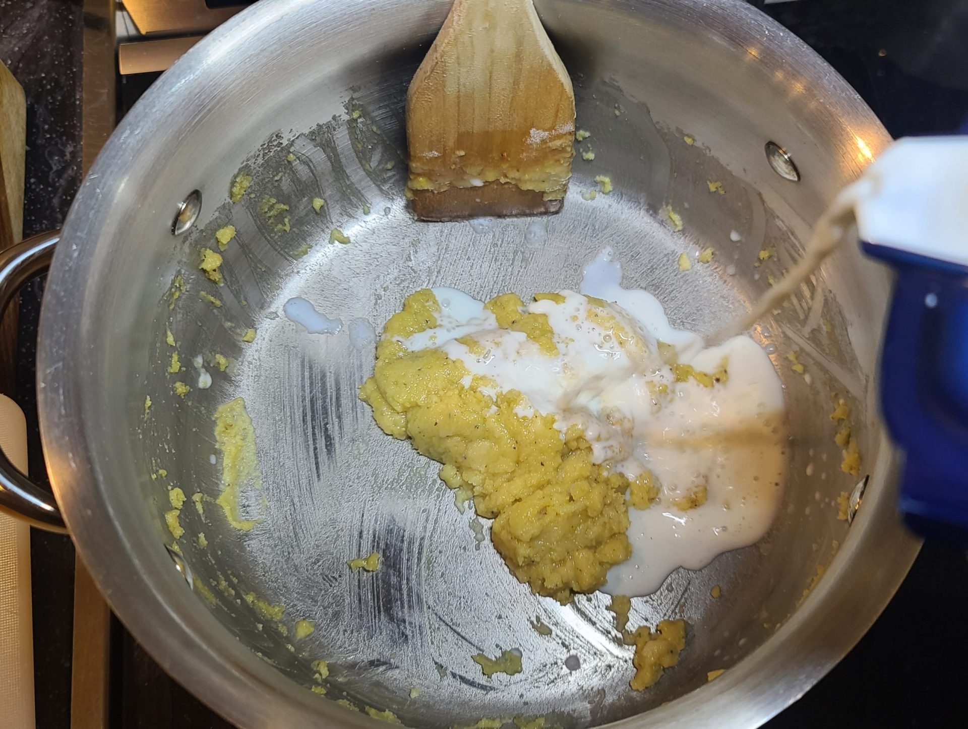 - Cook a few minutes and then whisk in milk until all clumps are gone and everything is incorporated.