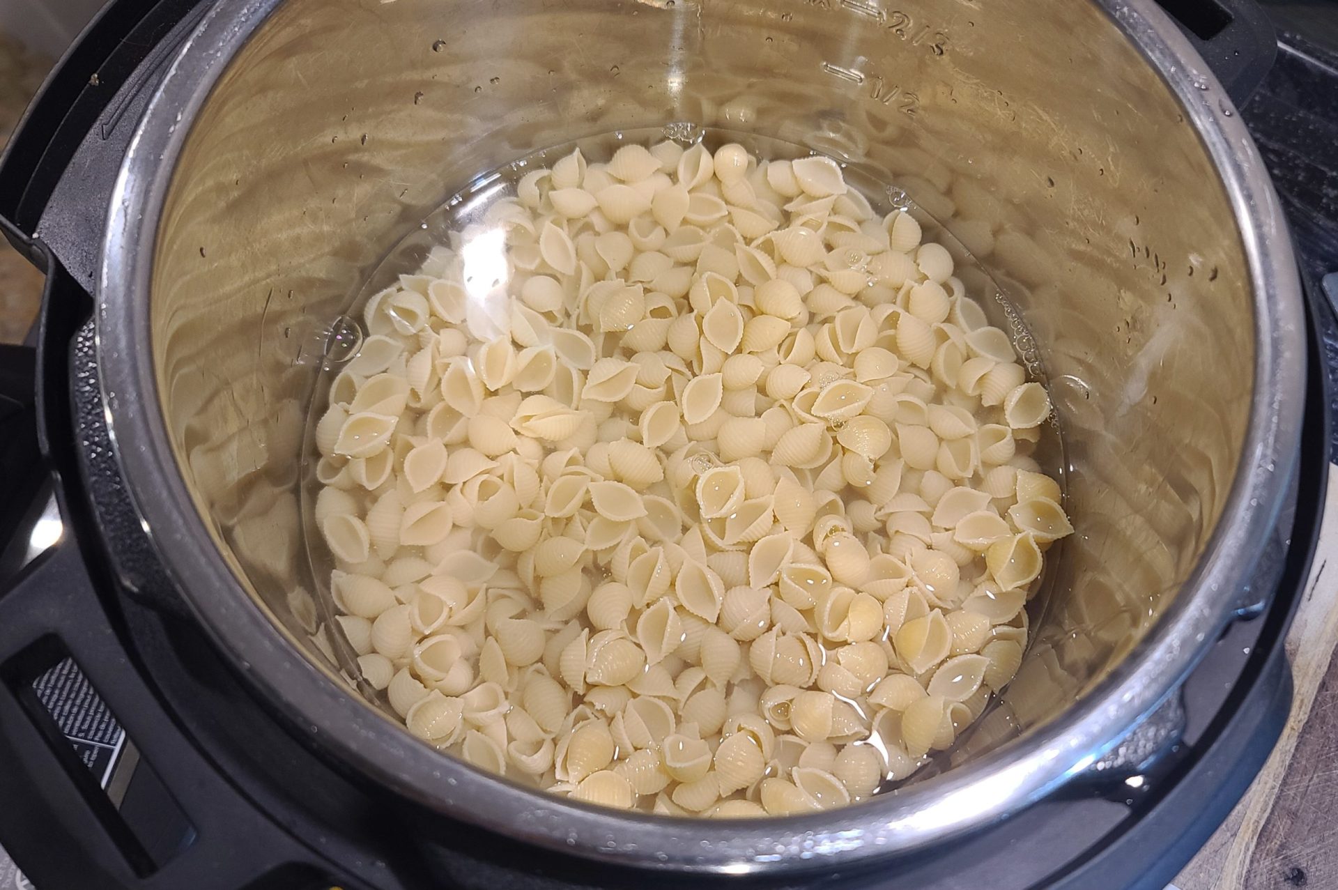 - Make pasta in instant pot by adding 16 oz dry small shell noodles with 4 cups water, then place rinsed and cut broccoli on top of the water. Pressure cook on high for 2 minutes, then allow to sit for 8 minutes before manual releasing steam.