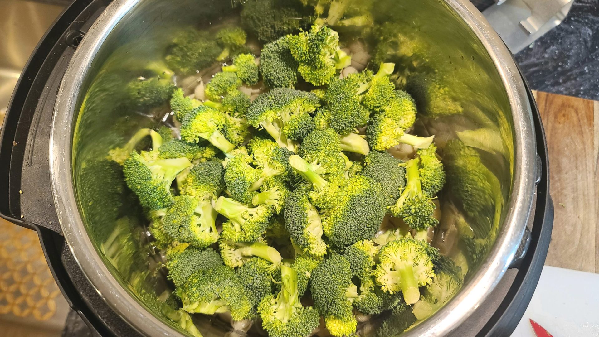 6. Make pasta in instant pot by adding 16 oz dry small shell noodles with 4 cups water, then place rinsed and cut broccoli on top of the water. Pressure cook on high for 2 minutes, then allow to sit for 8 minutes before manual releasing steam.