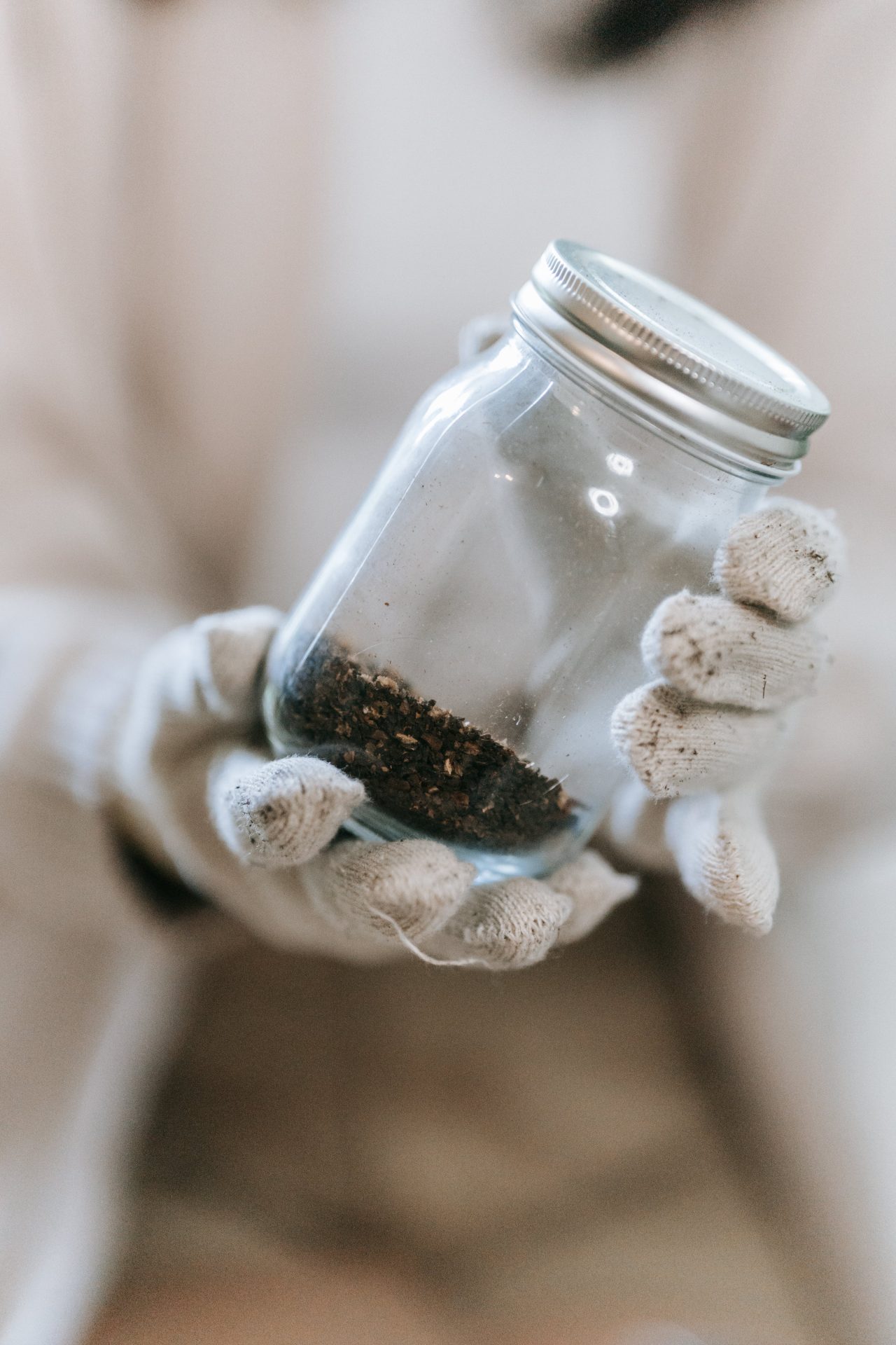 - Fill the clear glass jar about one-third to one-half full with the soil sample.