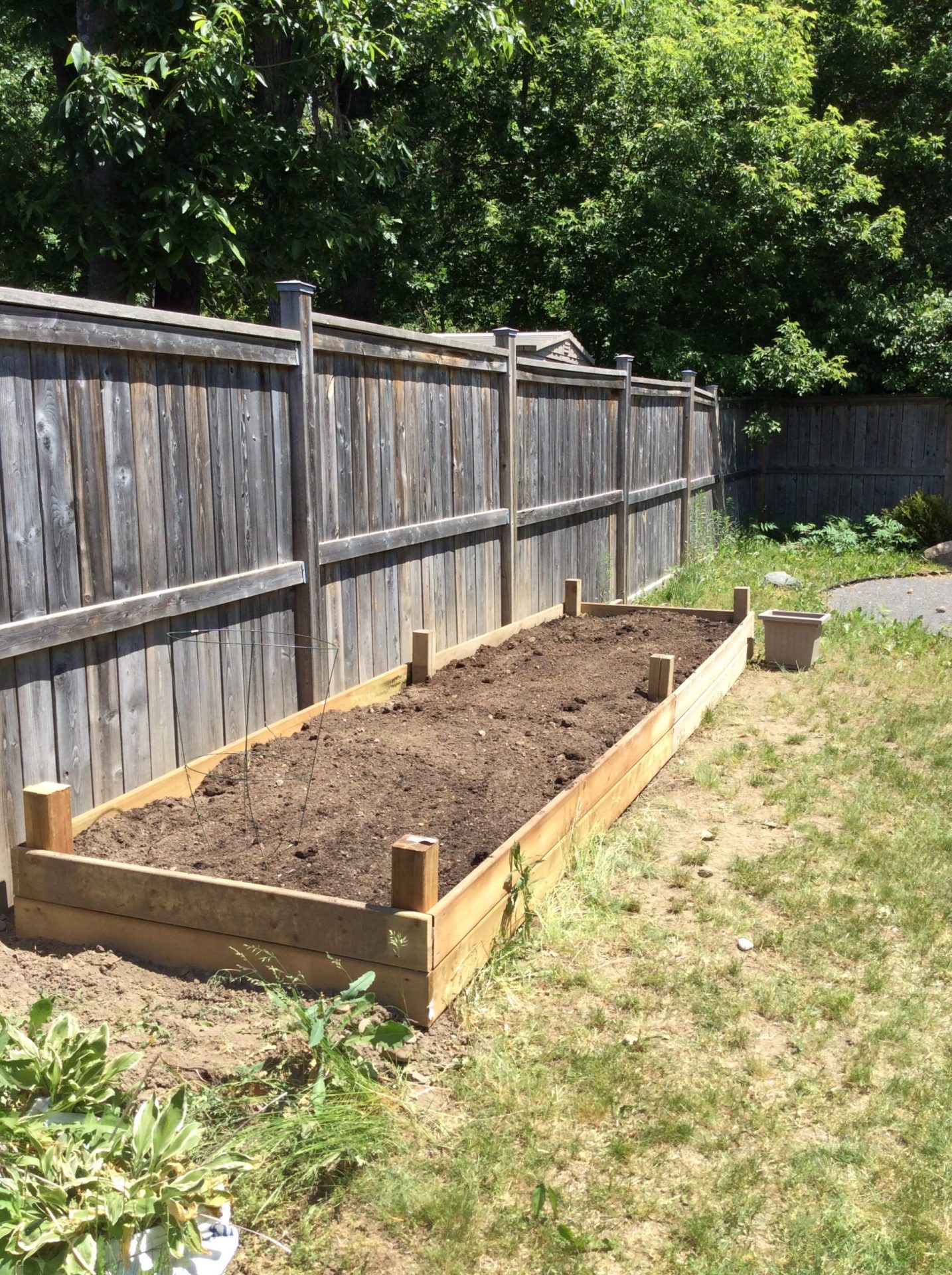 Decide on the size of your raised bed garden based on available space and soil requirements. Since I had a lot of soil to use up from the fire pit area, I opted to make two sections with deck boards and 4x4 posts, cut up and dug into the ground so they didn’t budge.